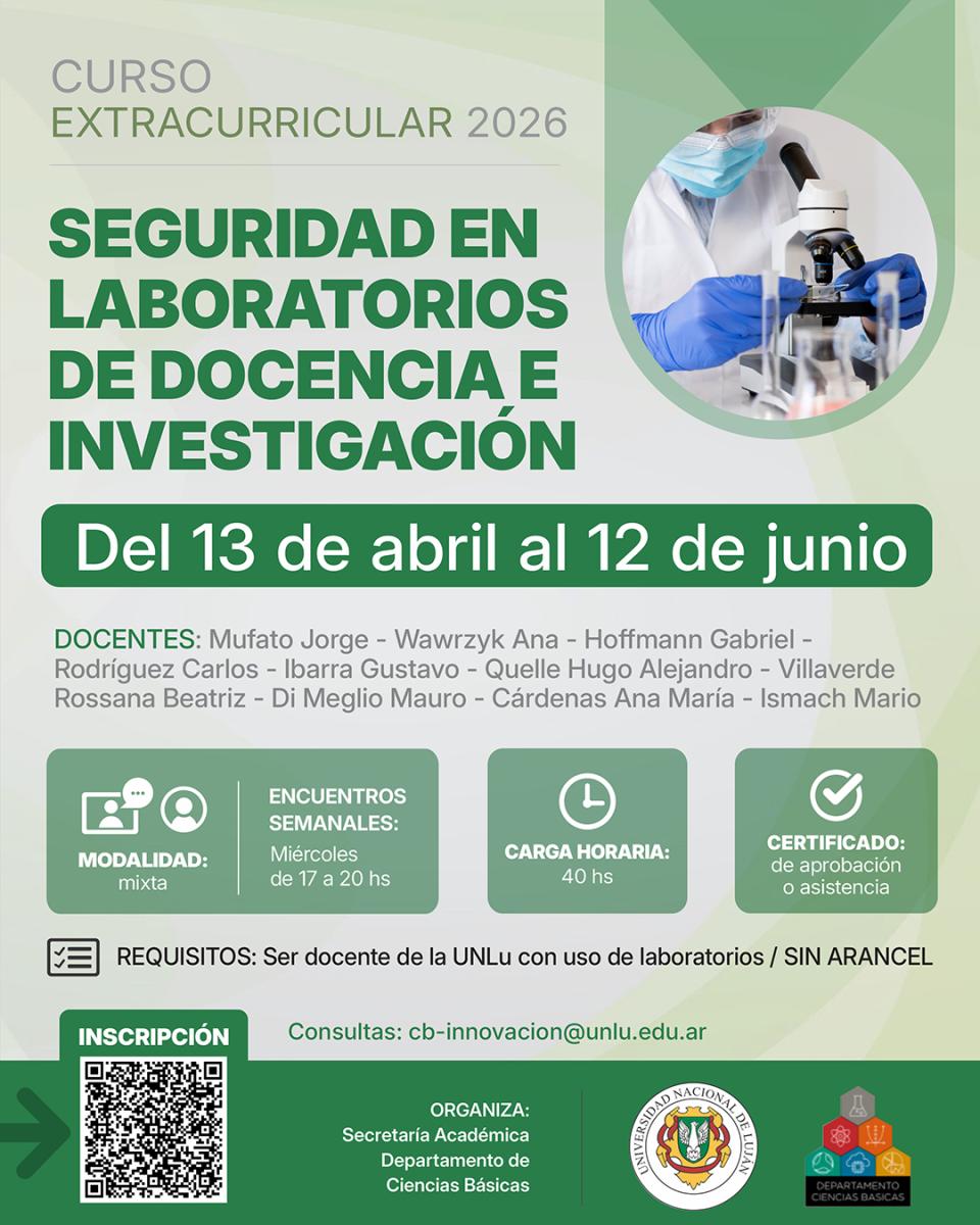 La Secretaría Académica del Departamento de Ciencias Básicas invita a participar del curso de posgrado y extracurricular “Seguridad en Laboratorios de docencia e investigación”. Aprobado por el Consejo Departamental de Ciencias Básicas mediante DISPCD-CB : 462 / 2025 y DISPCD-CB : 463 / 2025 .