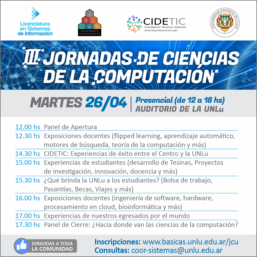 La Carrera de Licenciatura en Sistemas de Información, en conjunto con el Centro de Investigación, Docencia y Extensión en Tecnologías de la Información y Comunicación (CIDETIC), y con aval académico del Departamento de Ciencias Básicas organiza las III Jornadas de Ciencias de la Computación (III-JCU).